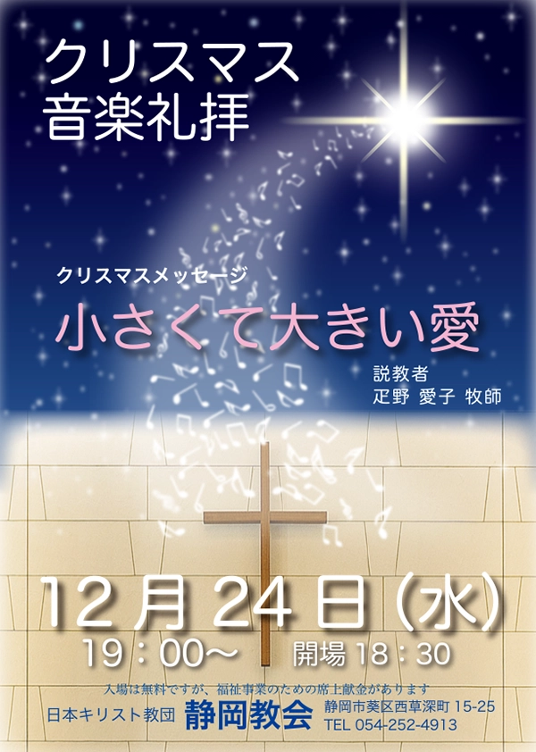 | 水曜日 | 祝福とお祈りの会 (祈祷会) | ①AM 10 : 30 ~ 11 : 00 ②PM 7 : 00 ~ 7 : 30 ※ 7月・8月はお休みです |